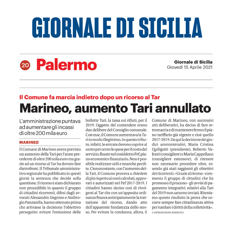 I cittadini hanno deciso così di rivolgersi al Tar che con un’apposita ordinanza fissava anticipatamente la trattazione del ricorso, dando atto dell’apparente fondatezza dello stesso. Per evitare la condanna, allora, il Comune di Marineo, con successivi atti deliberativi, ha deciso di fare retromarcia e di mantenere fermo il piano tariffario già vigente e cioè quello 2017-2018. Da qui la decisione dei giudici amministrativi, Maria Cristina Quiligotti (presidente), Roberto Valenti (consigliere) e Maria Cappellano (consigliere estensore), di ritenere non necessario procedere oltre, essendo già stati raggiunti gli obiettivi dei ricorrenti.