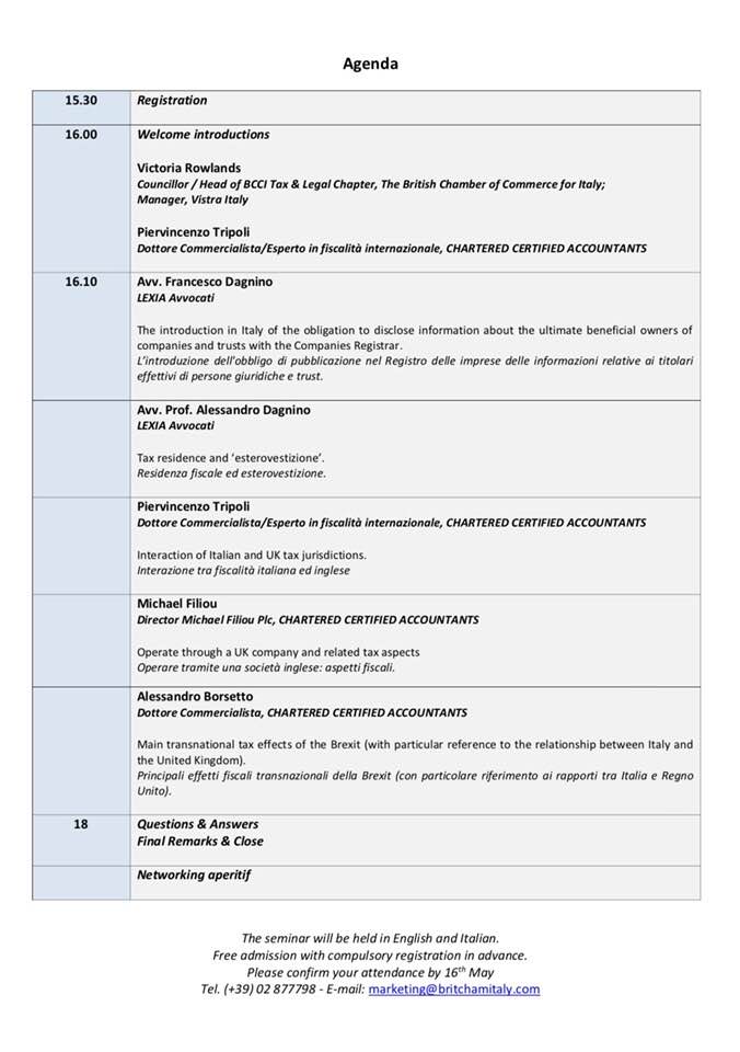CONTINUA →Il prossimo martedì, 22 maggio, all’hotel Principe di Savoia di Milano, l’avv. prof. Alessandro Dagnino, interverrà in materia di residenza fiscale ed esterovestizione, in occasione del seminario organizzato dalla Camera di commercio britannica per l’Italia sul tema: “Operare in Italia con una società di diritto inglese: cosa cambierà dopo la Brexit?”.