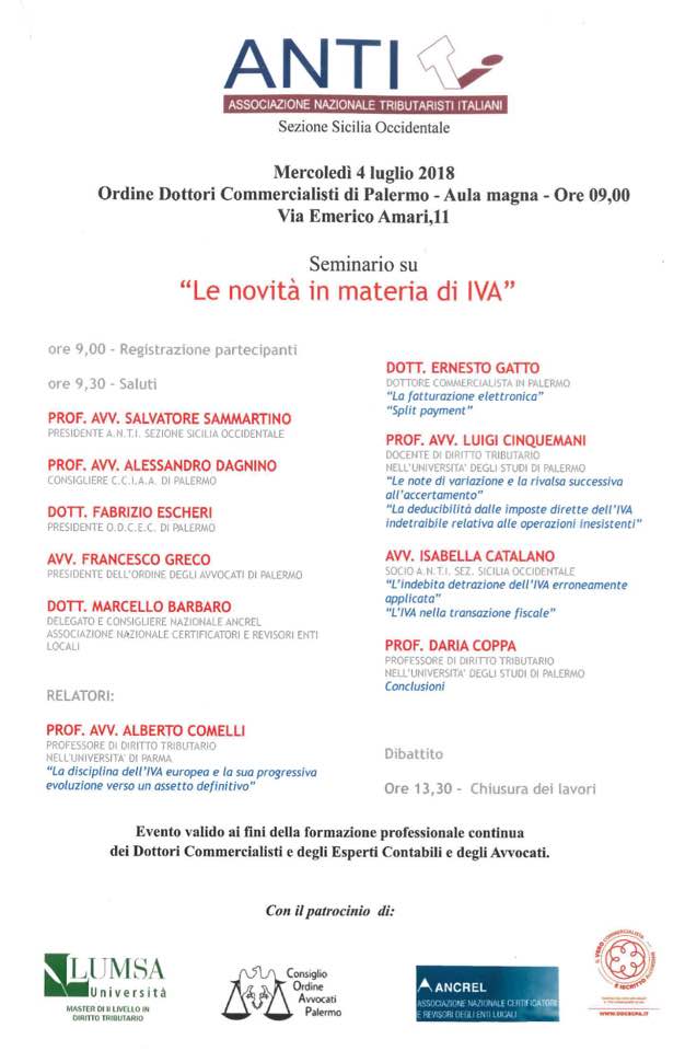 CONTINUA →Mercoledì, 4 luglio 2018, l’avv. prof. Alessandro Dagnino interverrà al convegno organizzato dall’ANTI Sicilia occidentale su “Le novità in materia di IVA”.