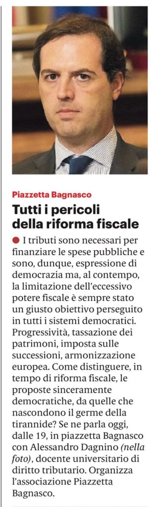 Giovedì 10 giugno alle ore 19.00, l’avvocato e professore Alessandro Dagnino interverrà nell’evento “Il sistema fiscale tra tirannia e democrazia”, secondo appuntamento con il ciclo di incontri proposti dall’associazione Piazzetta Bagnasco. L’appuntamento si svolgerà nell’omonimo luogo palermitano e sarà introdotto da Donato Didonna.