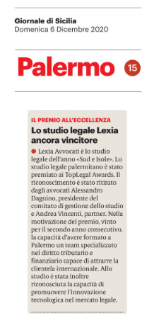 Nella motivazione del premio si sottolinea la capacità d’avere formato nella città di Palermo un team specializzato nel diritto tributario e finanziario capace di attrarre la clientela internazionale. Allo studio è stata inoltre riconosciuta la capacità di promuovere l’innovazione tecnologica nel mercato legale. LEXIA Avvocati riceve il premio “Sud e Isole” per il secondo anno consecutivo.