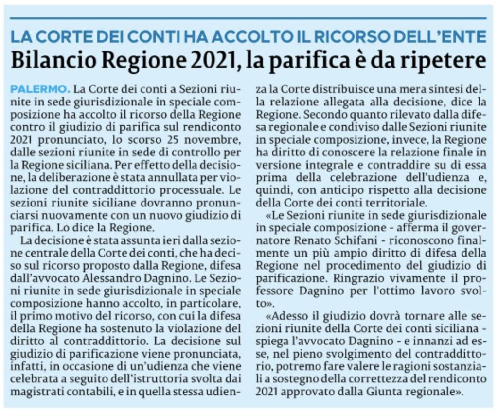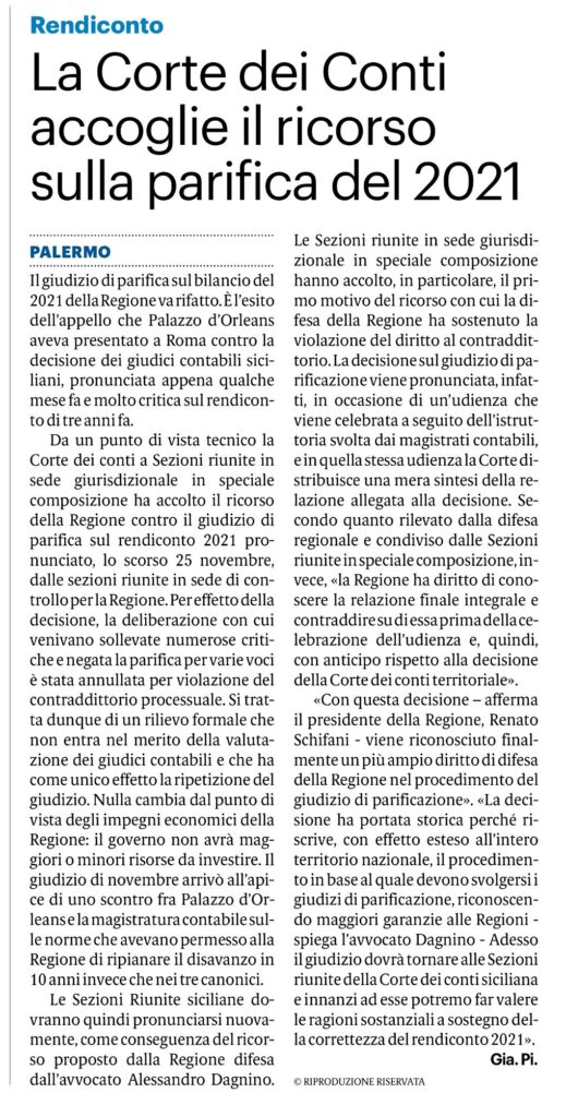 “La decisione ha portata storica perché riscrive, con effetto esteso all’intero territorio nazionale, il procedimento in base al quale devono svolgersi i giudizi di parificazione, riconoscendo maggiori garanzie alle regioni” afferma l’avvocato Alessandro Dagnino, che aggiunge: “adesso, il giudizio dovrà tornare alle Sezioni riunite della Corte dei conti siciliana e innanzi ad esse, nel pieno svolgimento del contraddittorio, potremo far valere le ragioni sostanziali a sostegno della correttezza del Rendiconto 2021 approvato dalla giunta regionale”.