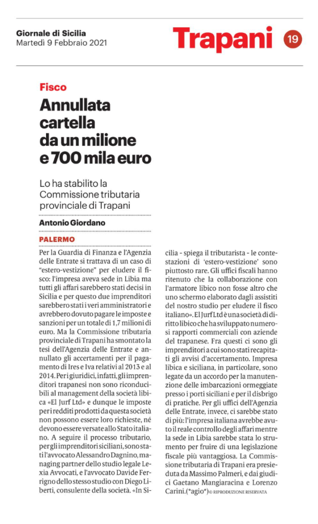 A seguire il processo tributario, per gli imprenditori siciliani, sono stati l’avvocato Alessandro Dagnino, managing partner dello studio legale LEXIA Avvocati, e l’avvocato Davide Ferrigno, dello stesso studio unitamente al dottor Diego Di Liberti, consulente della società. “In Sicilia – spiega Dagnino – le contestazioni di ‘estero-vestizione’ sono piuttosto rare. Gli uffici fiscali hanno ritenuto che la collaborazione con l’armatore libico non fosse altro che uno schermo elaborato dagli assistiti del nostro studio per eludere il fisco italiano. Abbiamo, così, dovuto dimostrare che, invece, le operazioni estere rappresentavano un caso di eccellenza imprenditoriale”.