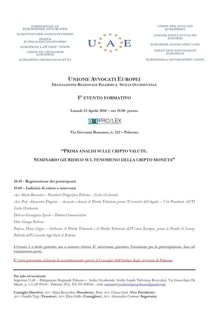 Il prossimo 23 aprile l’avv. prof. Alessandro Dagnino interverrà come relatore al seminario sulle cripomonete organizzato dall’Unione degli Avvocati Europei di Palermo, presieduta dall’avv. Maria Bruccoleri.