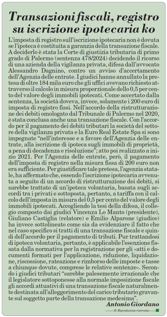 L’imposta di registro sull’iscrizione ipotecaria non è dovuta se l’ipoteca è costituita a garanzia della transazione fiscale. A deciderlo è stata la Corte di Giustizia tributaria di Palermo decidendo il ricorso di un gruppo societario operante nel settore della vigilanza privato, difeso dall’avvocato Alessandro Dagnino, contro un avviso d’accertamento dell’Agenzia delle Entrate.